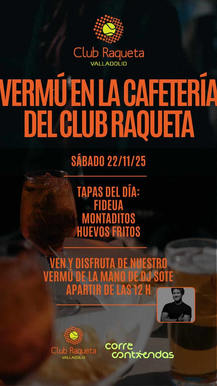 Cafeteria CLUB RAQUETA organiza el proximo dia 22 de Noviembre, sábado a las 12h VERMU acompañado de DJ SOTE- Musica y vermú una buena combianción para una mañana de sábado- ¿Te reservamos una pista de padel/tenis para antes del vermú?-